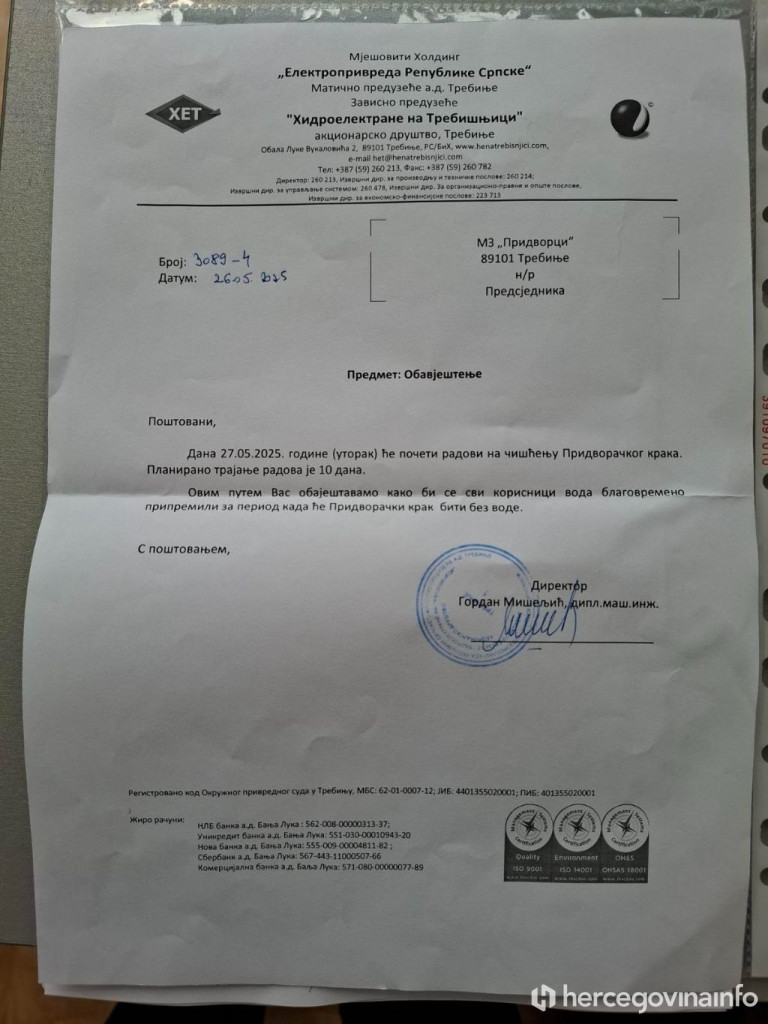 “Prema dokumentu vidimo da su radovi planirani u okviru deset dana, danas je 12. dan, mašine i dalje stoje u koritu, uništen je vodeni svijet, sišli smo suprug i ja pošto živimo odmah do rijeke u korito, tu je bila gomila rakova, gomila mrtve ribe, poznato je da gdje ima rakova tu je čista voda. Sad više nema ništa, sve je isušeno, sve je mrtvo, uništeno, dakle jedan ogroman ekocid je urađen što je zaista velika šteta, a druga stvar ovo se sve moglo uraditi kao što se i ranije radilo bez isušivanja već da ima normalan protok, smanji se malo protok rijeke i bageri uđu, izvade ono što treba da izvade od smeća, očiste dno i nastavi tok rijeke. U svemu ovome, uopće nije bio problem da se isuši i pričini ovakva šteta već je bio problem stajaća rijeka koja je pravila problem jer se zadržavalo smeće. Da je bilo protoka, ništa od toga ne bi bilo, ni smeća, ni mulja ni trave. Gospodin Mišeljić je na Skupštini rekao kako nema nikakve veze biološki minimum s ovim trenutačnim stanjem Pridvoračkog kraka, međutim, naravno da ima jer kad nemamo protok rijeke, kad sve ode za Plat, normalno da će se ovdje itekako osjetiti posljedice”, kaže Milišić za Hercegovina.info.