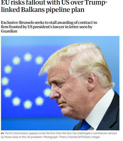 Ovo je prvi put da se Bruxelles izravno suprotstavlja projektu koji uključuje osobe bliske američkom predsjedniku, što dodatno pojačava političku dimenziju cijelog slučaja, tvrdi novinar Guardiana, Tom Burgis.