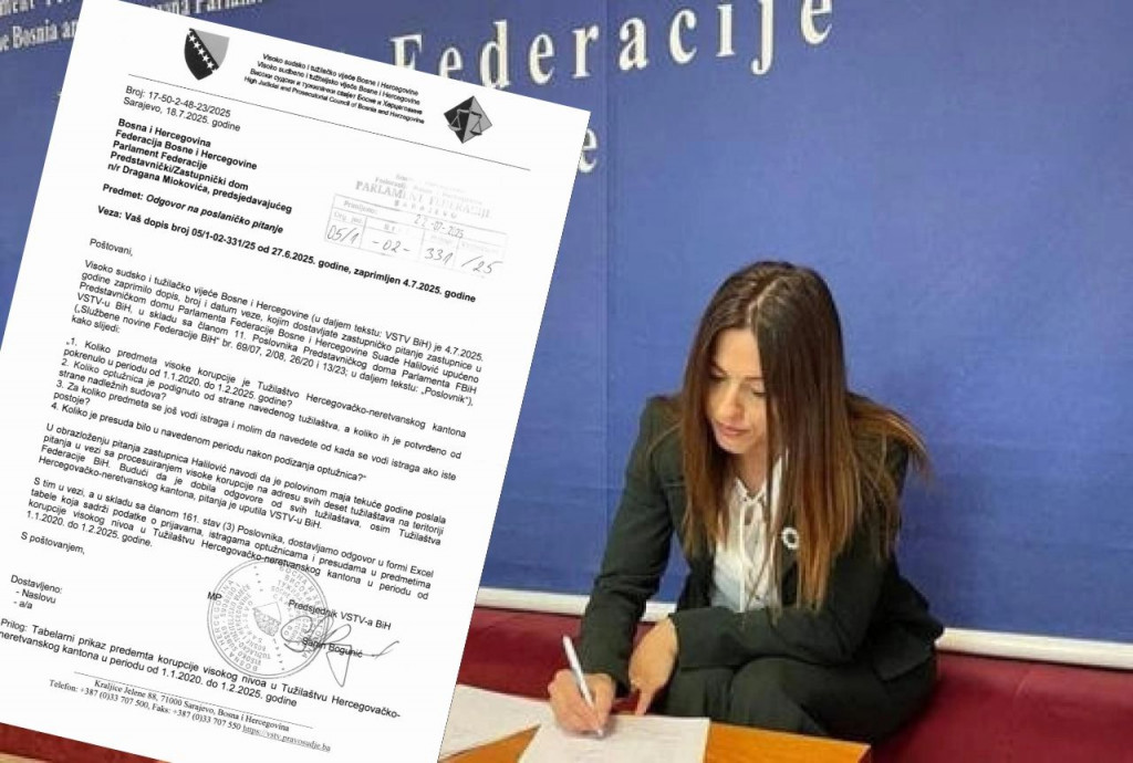 Zastupnica u Parlamentu Federacije Bosne i Hercegovine Suada Halilović dobila je odgovor na svoje zastupničko pitanje koje je uputila Visokom sudbenom i tužiteljskom vijeću Bosne i Hercegovine (VSTV), a tiče se broja predmeta visoke korupcije koje je Tužiteljstvo Hercegovačko-neretvanske županije (HNŽ) vodilo u posljednjih pet godina.