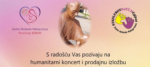 Na humanitarnom koncertu i prodajnoj izložbi moći ćete dijeliti radost zajedništva, darivanja, uživati u ljepoti glazbe te Vašim najdražima nabaviti dar koji ih raduje. Sudjelovanjem u programu i kupovinom ponuđenih dječjih radova, darova Prijatelja Maloga Isusa, sestarskih kolačića..., pomoći ćete školovanje djece Stadlerova dječjeg Egipta u Sarajevu.