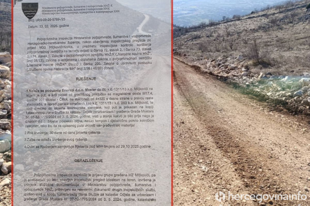 Rješenjem od 13. veljače 2026. godine, inspekcija nalaže da se dio parcele k.č. 1311/13 k.o. Miljkovići vrati u stanje kakvo je bilo prije izvođenja radova. Rok izvršenja je 30 dana od primitka rješenja, a žalba ne odlaže njegovo izvršenje.