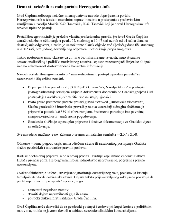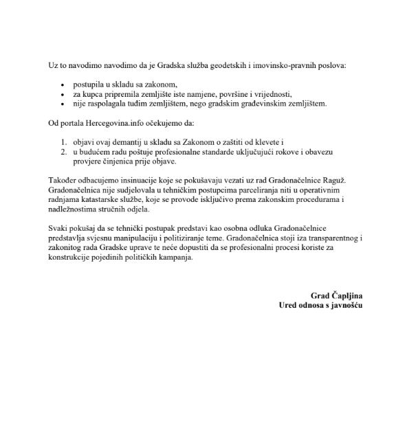 Redakcija Hercegovina.info objavljuje reakciju Grada Čapljine sukladno Zakonu o zaštiti od klevete, ali ostaje pri navodima iz izvornog članka, koji su potkrijepljeni službenim dokumentima, zemljišnim izvacima i odlukama Gradskog vijeća Čapljine.