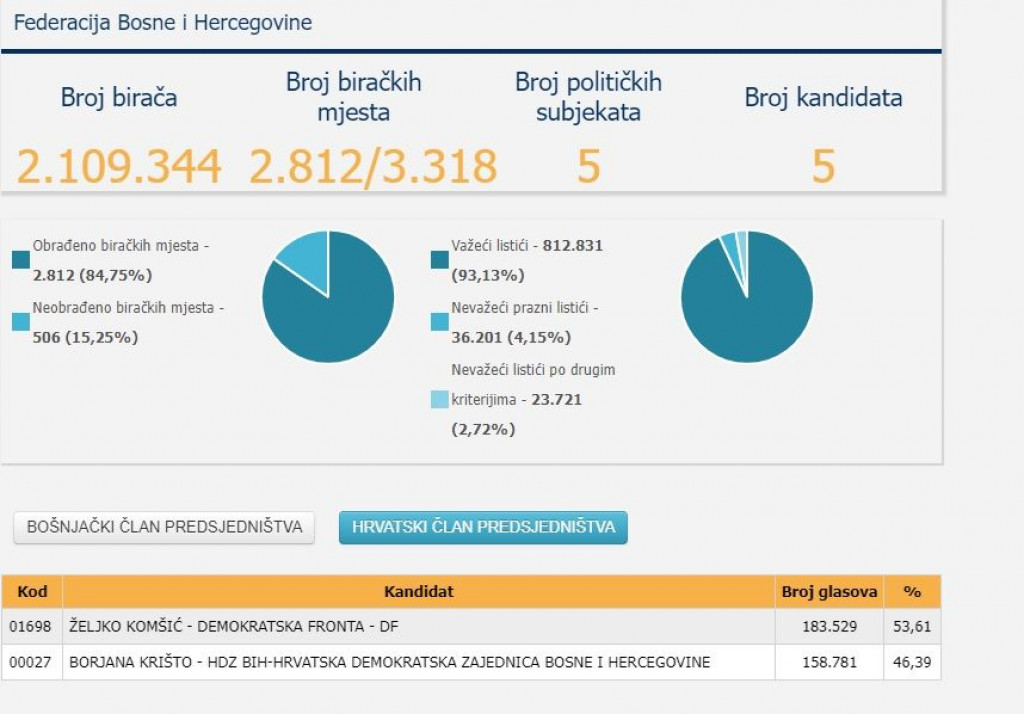 Podsjetimo, sinoć su objavljeni rezultati za člana Predsjedništva BiH iz reda hrvatskog naroda. Navedeno je da je obrađeno 1.816 biračkih mjesta ili 54,73 posto, a važećih lističa bilo je 518,583 ili 93,04 posto.