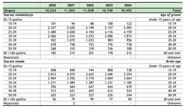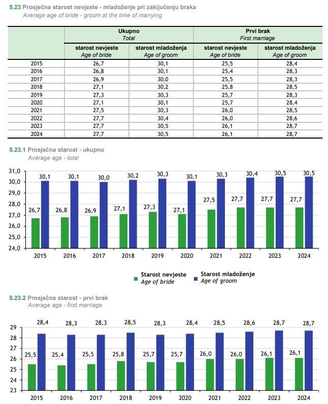 Podaci o dobi mladenaca jasno pokazuju da se brak sklapa sve kasnije. Prosječna dob mlade u 2024. godini iznosila je 27,7 godina, dok je prosječna dob mladoženje bila 30,5 godina. Kod prvog braka prosjek je nešto niži, ali i tu je vidljiv rast u odnosu na prethodno desetljeće.