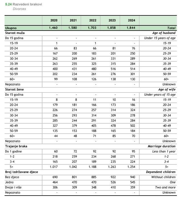 Broj razvedenih brakova u 2024. godini iznosio je 1.844, što je tek neznatno manje nego godinu ranije, ali znatno više nego 2020. godine. U odnosu na razdoblje prije pandemije, razvodi su u stalnom porastu.