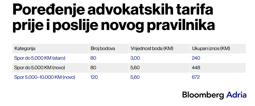Odvjetnička komora Federacije BiH usvojila je novu tarifu za obračun odvjetničkih usluga, koja donosi brojne novine, a najvažnija je promjena načina obračuna vrijednosti boda. Kako je za Bloomberg Adriu pojasnila predsjednica Upravnog odbora Komore Tanja Hadžagić, cilj novih odredbi je „dugoročna stabilnost i pravičniji obračun odvjetničkih usluga“.