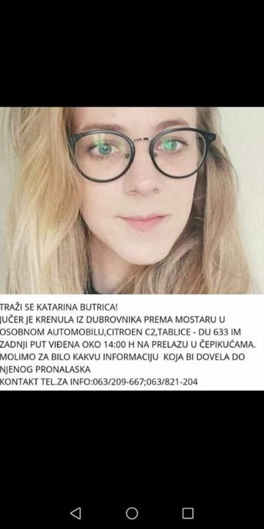 Nestala je Katarina Butrica koja je jučer krenula iz Dubrovnika prema Mostaru u osobnom automobilu plave boje, Citroen C2, tablice DU 633 IM. Zadnji put je viđena oko 14 sati na prijelazu u Čepikućama. Obitelj moli za bilo kakvu informaciju, koja bi dovela do Katarininog pronalaska.