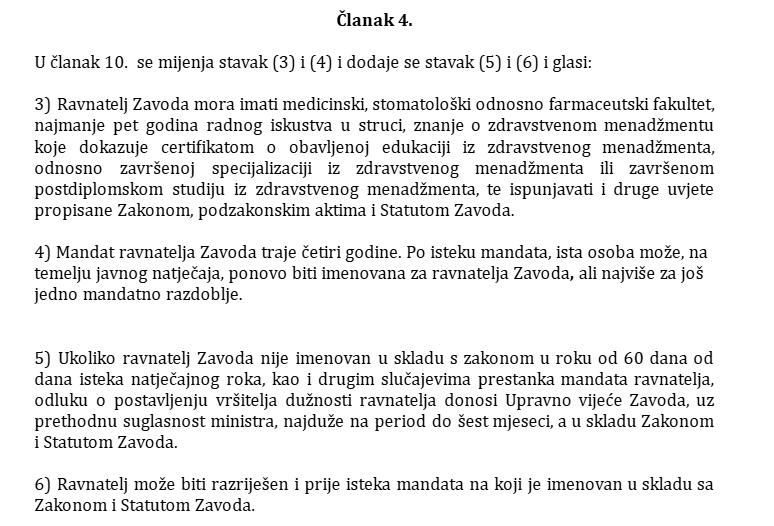 “Znači, faktično više nemamo liječnika koji bi mogli preuzeti upravljanje Zavodom, a stomatolozi su također liječnici. Ne možemo ostati u ćorsokaku. Ovo je pokušaj da Zavod stavimo na zdrava koljena, pa i na zdrave noge, ako Bog da”, rekao je Bevanda koji je objasnio kako se ovaj uvjet mijenja zbog oskudnog kadra.