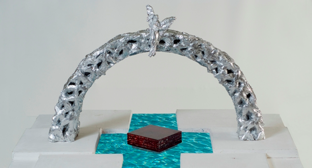 "Spomenik se sastoji od pravilnog trokutastog postolja platoa na kojem se nalazi kvadratični portal koji se tlocrtno sužava prema vrhu trokuta, a na isti način se oblikuje i gornja stranica, a iza portala je kugla podijeljena na četiri jednaka dijela koji svojim procijepima formiraju svjetlosni križ. Konstruktivno, ova četiri elementa povezana su manjim elementima u obliku kocke. Portal je otvoren prema jugu, a sužava se prema sjeveru gdje se nalazi podijeljeni kuglasti element" (natječajni rad).