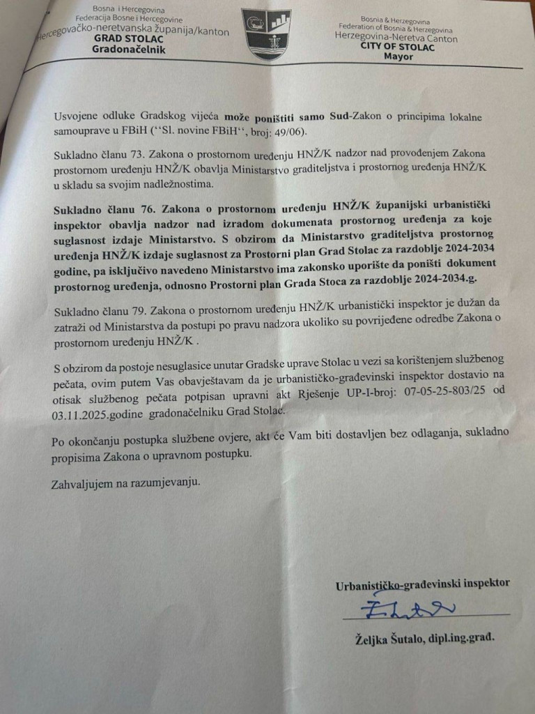 U dopisu upućenom gradonačelniku Stoca, urbanističko–građevinski inspektor podsjeća da prema Zakonu o prostornom uređenju HNŽ nadzor nad dokumentima prostornog uređenja provodi Ministarstvo građenja, te da odluke Gradskog vijeća može poništiti isključivo sud.