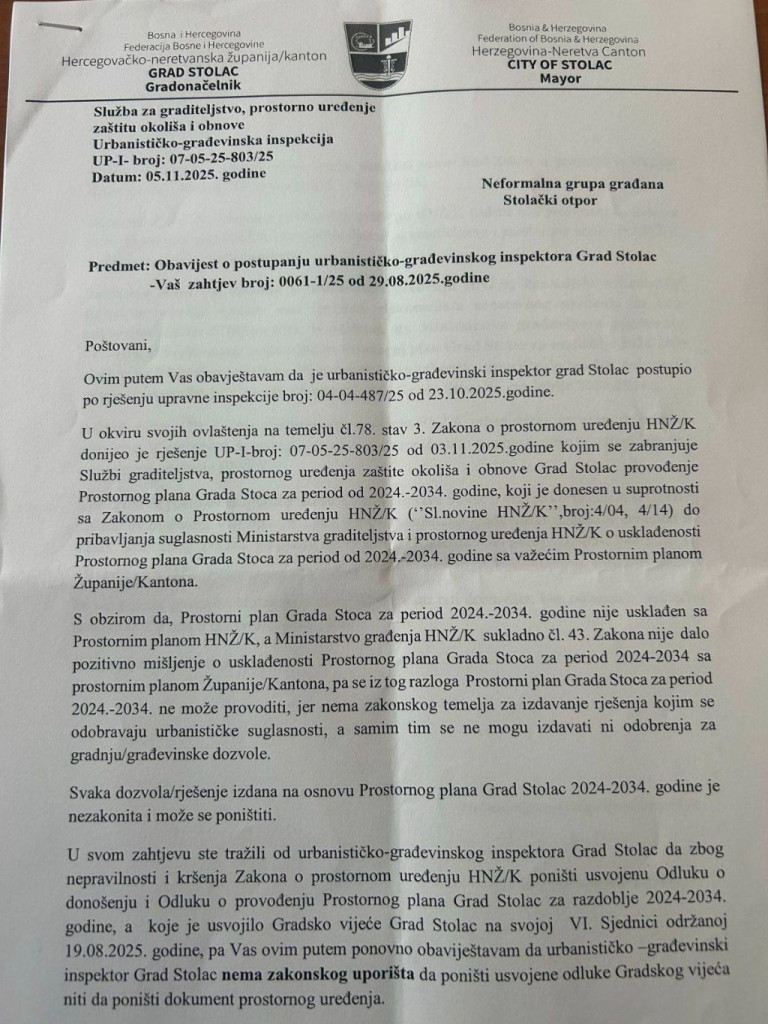 „Obavješteni smo da je urbanističko-građevinski inspektor Grada Stoca postupio u skladu sa rješenjem Upravne inspekcije HNŽ, te donio rješenje kojim se zabranjuje provođenje Prostornog plana Grada Stoca 2024–2034. godine, a samim tim se ne mogu izdavati ni odobrenja za gradnju ili građevinske dozvole. Svaka dozvola/rješenje izdana na osnovu Prostornog plana Grad Stolac 2024–2034. godina je nezakonita i može se poništiti.“