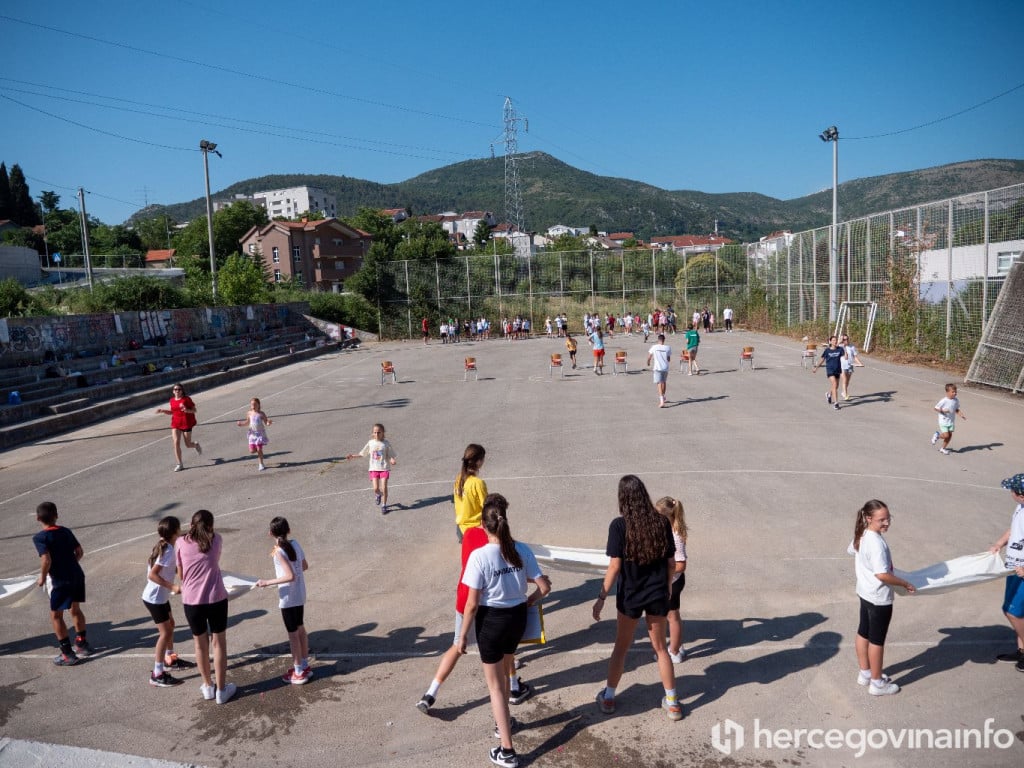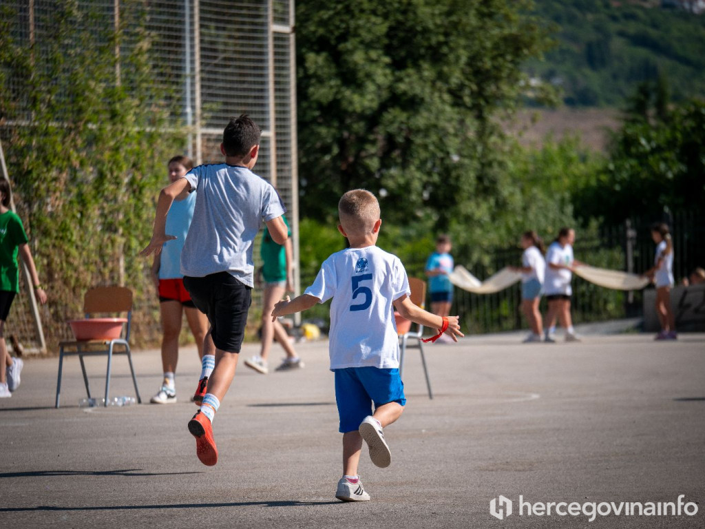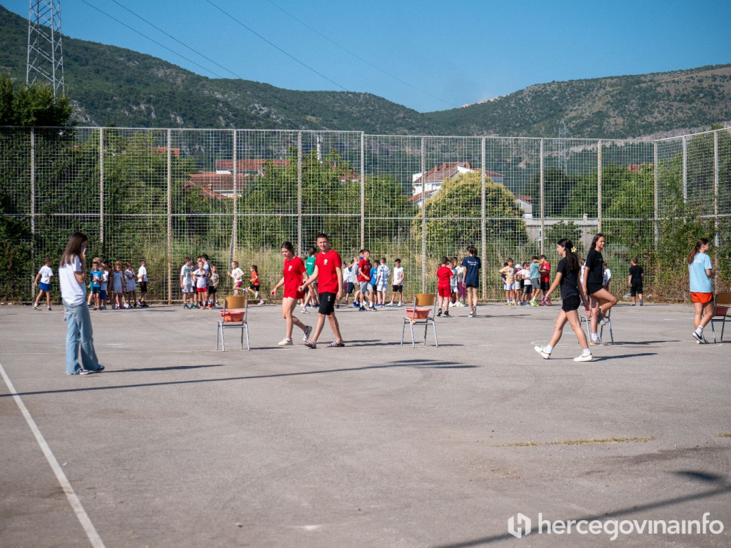 Princip jutarnjeg programa u ovoj župi je otprilike isti kao i u prethodnoj. Naime, ujutro djeca i animatori dođu u crkvu gdje otpjevaju himnu Duge i pjesmu koja je povezana sa Dugom, nakon čega se pomole. Animatorica naglašava kako prije početka pregledaju u kakvom su raspoloženju djeca. Kaže da, ovisno jesu li umorni, razbuđeni ili pospani, igre i atmosfera mogu znantno varirati. Nakon toga, nastavljaju sa jutarnjom gimnastikom i prelaze na igre. Kada mostarsko sunce postane neizdrživo, pređu u školsku dvoranu u vlasništvu Osnovne škole Silvija Strahimira Kranjčevića. „Imamo neke igre sa pitanjima, koja prilagodimo prema dobi i kroz koje razvijamo vjerski aspekt, tako da ne bude cijelo vrijeme samo obična igra. Vanjske igre su najčešće igre rashladnog karaktera, sa vodom ili vodenim balonima i slično, a kada pređemo u dvoranu više se koncentriramo na pitanja”, dodaje animatorica.