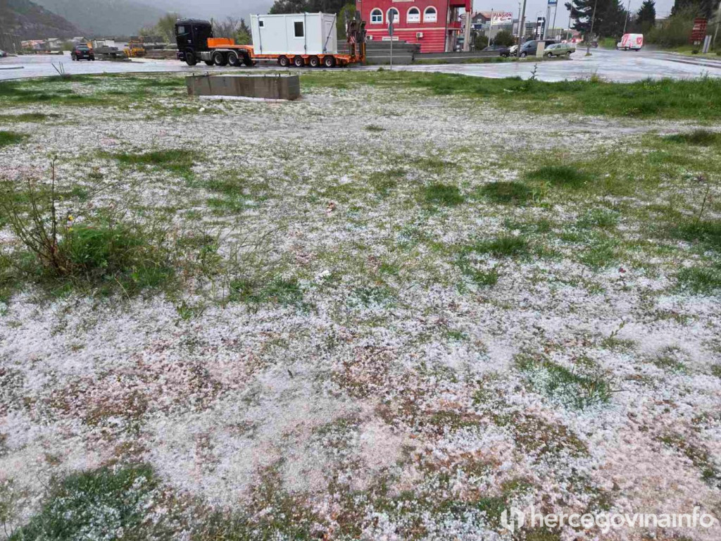 Dijelove Hercegovine danas je zahvatilo snažno nevrijeme praćeno pljuskovima i tučom, a snimke i fotografije iz Neuma, Međugorja i Mostara pokazuju kako je led u kratkom vremenu prekrio tlo i prometnice.