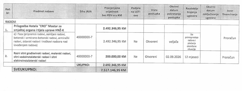 Plan obuhvaća potrebe vlade, ministarstava i drugih institucija županijske uprave, a među najvećim pojedinačnim stavkama nalaze se adaptacija hotela ERO u Mostaru, nabava goriva za službena vozila te uredski materijal.