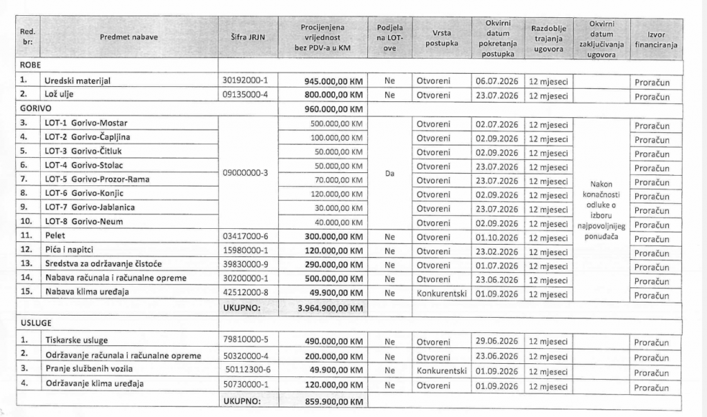 Odmah iza toga nalazi se nabava lož ulja vrijedna 800.000 KM, dok je značajan iznos planiran i za gorivo za službena vozila institucija.