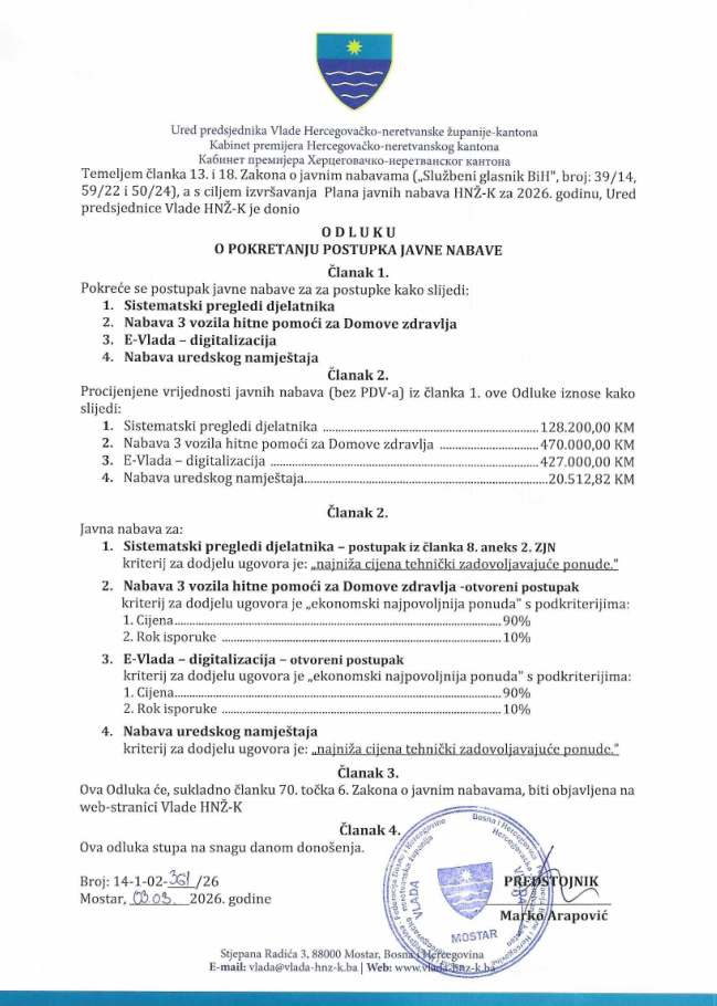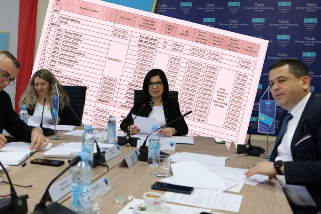 Vlada Hercegovačko-neretvanske županije usvojila je plan javnih nabava za 2026. godinu prema kojem će za nabavu roba, usluga i radova biti potrošeno više od 7,5 milijuna konvertibilnih maraka bez PDV-a, doznaje Hercegovina.info
