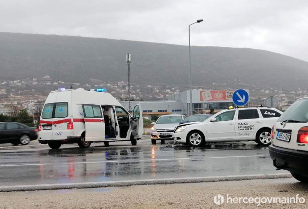 Na magistralnoj cesti M-17, na južnom ulazu u Mostar danas oko 11:30 sati došlo je do sudara tri vozila. Sudjelovali su taksi vozilo Škoda, te dva osobna automobila Opel.