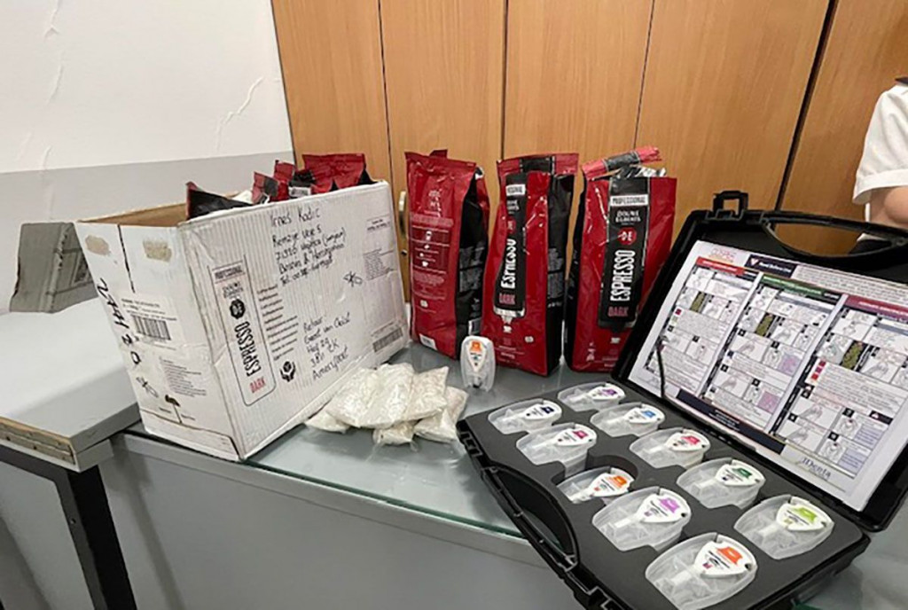 Naime, fizičkim pregledom pošiljki u unutrašnjosti prijavljenih stvari, u pakovanjima kave i kutiji za parfem pronađene su prikrivene pvc vrećice nepoznatog sadržaja koje su po izgledu asocirale na narkotička sredstva. Tom prilikom od strane ovlaštenih službenih osoba UNO izvršeno je testiranje istih jednokratnim testerima za narkotička sredstva prilikom čega je detektirano prisustvo psihoaktivnih supstanci tetrahidrokanabinola (THC) i spojeva feniletilamina i amfetaminske klase.