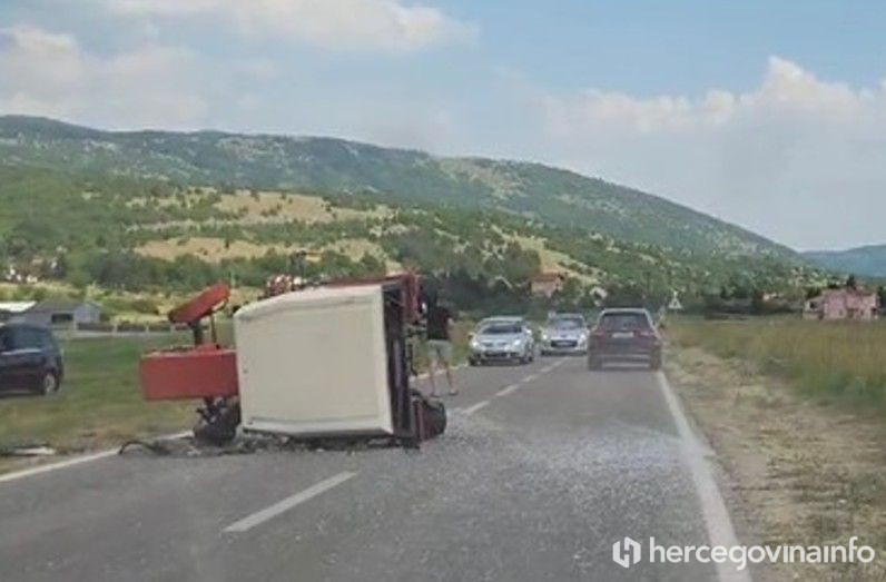 Kako se može vidjeti na snimci s mjesta događaja, vozilo se prepriječilo preko kolničke trake, a dijelovi stakla razasuti su po cesti. Kako doznajemo, do nesreće je došlo nakon što je kamion pokušao prestići trektor, te svojim zaadnjim dijelom udario u isti.