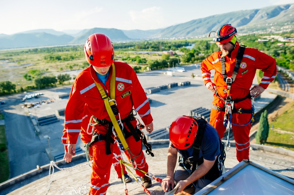 Toranjski je plavi napis na bijeloj podlozi osvježen novom bojom, u suradnji s pripadnicima Hercegovačke gorske službe spašavanja koji su, uz suglasnost Aluminijeve Uprave, iskoristili vitkoga ljepotana za trodnevne vježbe zahtjevnih spustova s velikih visina. Tvornički se vodotoranj pokazao izvrsnim za složene provjere spremnosti HGSS-ovaca, a suradnja je iznjedrila i obostranu korist. Hrabri djevojke i dečki koji čuvaju naše živote na najzahtjevnijim terenima ovoga podneblja i koji se na užadi i na visinama koje tjeraju strah u kosti osjećaju kao doma, uhvatili su se u koštac s opasnim bočnim dijelom toranjskoga prstena, vodeći osobit račun o sigurnosti pri svakomu koraku.