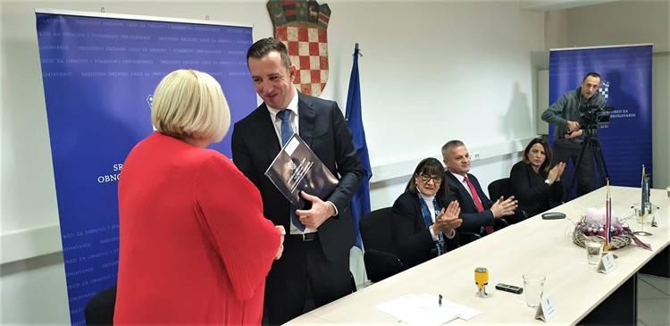 Državni tajnik Središnjeg državnog ureda za obnovu i stambeno zbrinjavanje Nikola Mažar je domaćin, a ugovore su uručili državna tajnica Ministarstva vanjskih i europskih poslova Zdravka Bušić te državni tajnik Središnjeg državnog ureda za Hrvate izvan Republike Hrvatske, Zvonko Milas.