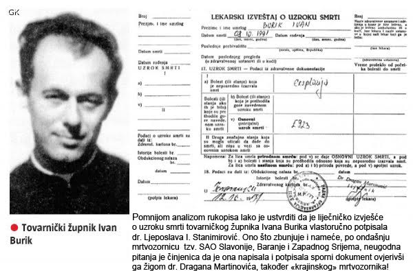 Kontroverzno je i liječničko izvješće mrtvozornice dr. Ljeposave Stanimirović od 12. listopada 1991. o uzroku Burikove smrti po kojemu on nije strijeljan, nego je poginuo od eksplozije. Postoje svjedoci koji su vidjeli Burikovo tijelo i uočili rupe od metaka. Više preživjelih tovarničkih logoraša, među kojima i Pavo Mijoković, svjedoči da su mještani našli velečasnog Burika mrtvoga na dvosjedu u podrumu. "Otkopčao sam mu vestu" - doslovce je izjavio - "i vidio rupe od metaka na njegovim prsima. Velečasnog smo stavili u sivu najlonsku vreću, odnijeli ga na traktorskoj prikolici na groblje i tamo ga položili pored ostalih ubijenih mještana."