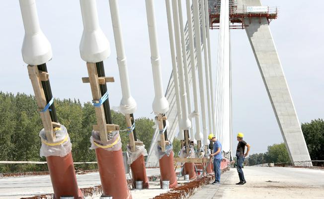 - Zatege završavaju na vrhu pilona, a ovdje dolje se mjeri sila u svakoj pojedinoj zatezi i na osnovi toga svaka će dati protuuteg. Ili pojednostavljeno, sada se radi njihovo finalno zatezanje, kojim će u cijelosti na sebe preuzeti nosivu ulogu - kaže Ević.
