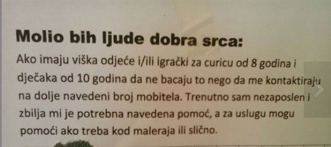 Riječi su to očajnog nezaposlenog oca Slobodana Majcena koji je prije dva dana oblijepio stupove u gradu Varaždinu ovim oglasom za pomoć.Dnevnik.hr ga je kontaktirao i provjerio o čemu se točno radi.