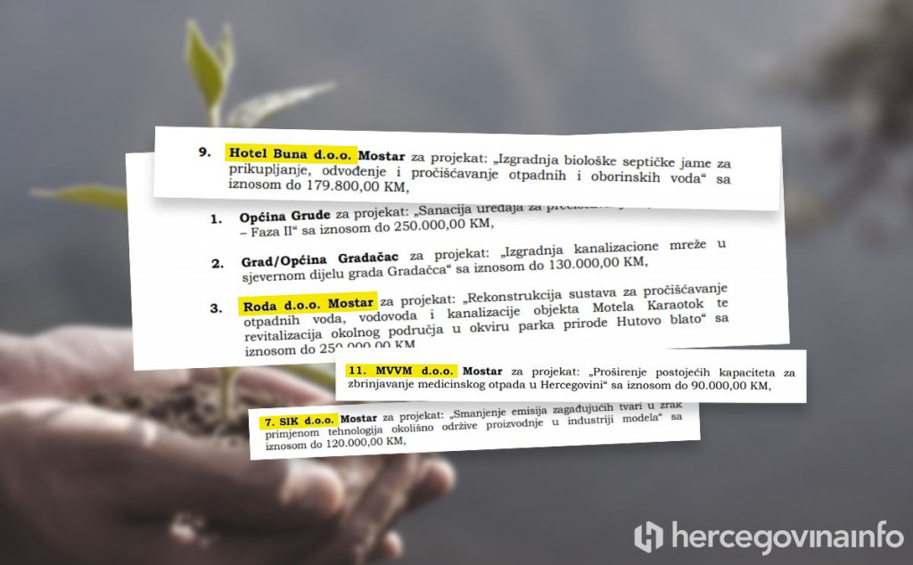 Upravni odbor Fonda za zaštitu okoliša Federacije BiH na prijedlog direktora na zadnjoj sjednici u 2020. je temeljem javnog poziva donio nekoliko odluka, zahvaljujući kojima će lijepa sredstva dobiti i hercegovačke tvrtke, a što su mediji i objavili. Međutim, nije objavljeno tko stoji iza pozamašnih cifri koje je putem javnog poziva podijelio SBB-ov direktor Fonda, a potpisala HDZ-ova predsjednica upravnog odbora Mirjana Milićević.