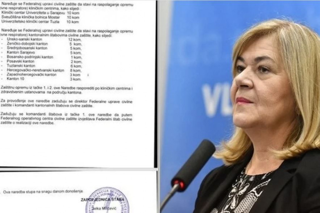 Zapovjednica Kriznog Stožera Federacije Bosne i Hercegovine Jelka Milićević jučer je potpisala odluku o raspodjeli spornih respiratora koje je iz Kine uvezla firma Srebrena malina. Postavlja se pitanje zašto je Milićević potpisala raspodjelu ukoliko se ranije požalila na nepravilnosti i ako se zna da je u tijeku istraga.