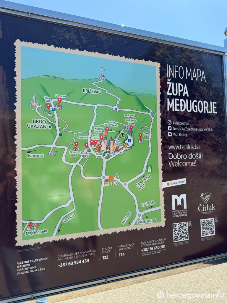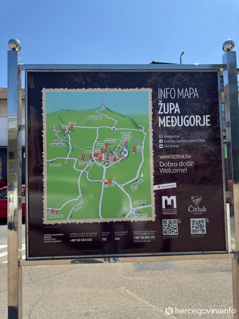 Prva info-mapa postavljena je na autobusnom kolodvoru u Međugorju, a u planu je postavljanje još deset takvih tabli u župi kako bi hodočasnicima omogućile lakšu orijentaciju, pružile sve potrebne informacije i olakšale boravak u našoj župi“, kazao je Kozina.