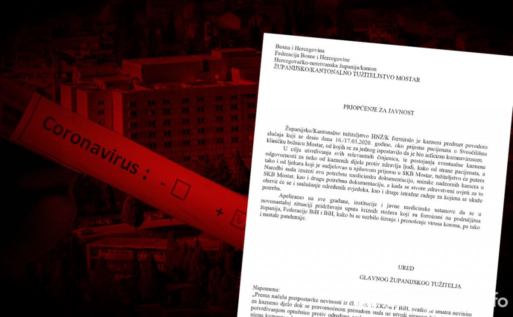 Županijsko tužiteljstvo HNŽ formiralo je kazneni predmet povodom slučaja koji se dogodio dana 16./17.03.2020. godine, oko prijema pacijenata u Sveučilišnu kliničku bolnicu Mostar, od kojih se za jednog ispostavilo da je bio inficiran koronavirusom.