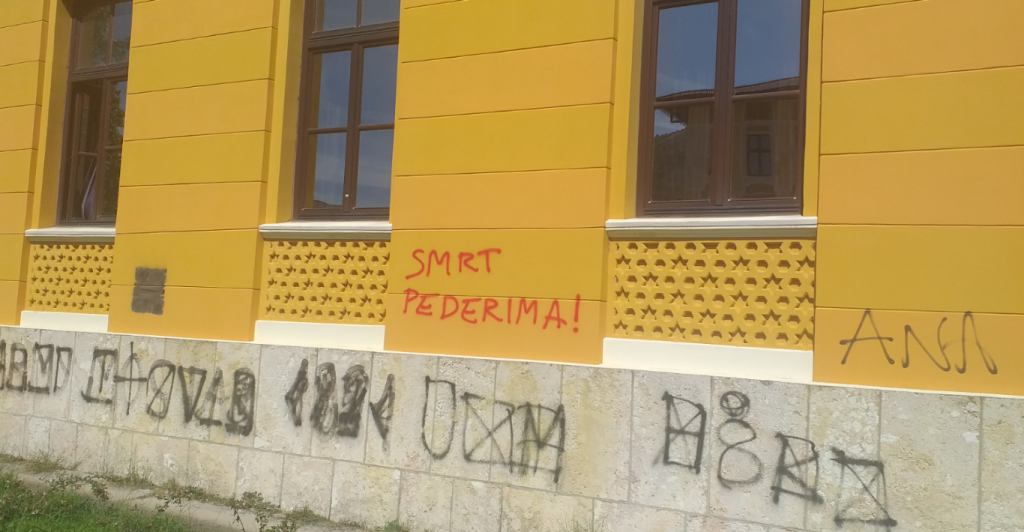 Na grafitima koji su ispisani crvenom bojom piše: 'Smrt pederima' i 'Ubij pedera'.