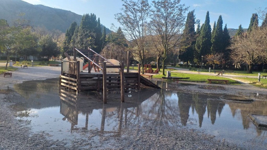 Naime, omiljeno okupljalište mostarskih mališana Park Zrinjevac je jutros prekriven vodom i sigurno uskoro neće biti uvjetan za igranje. Tobogani, ljuljačke i klackalice doslovce su u vodi i nemoguće im je prići.