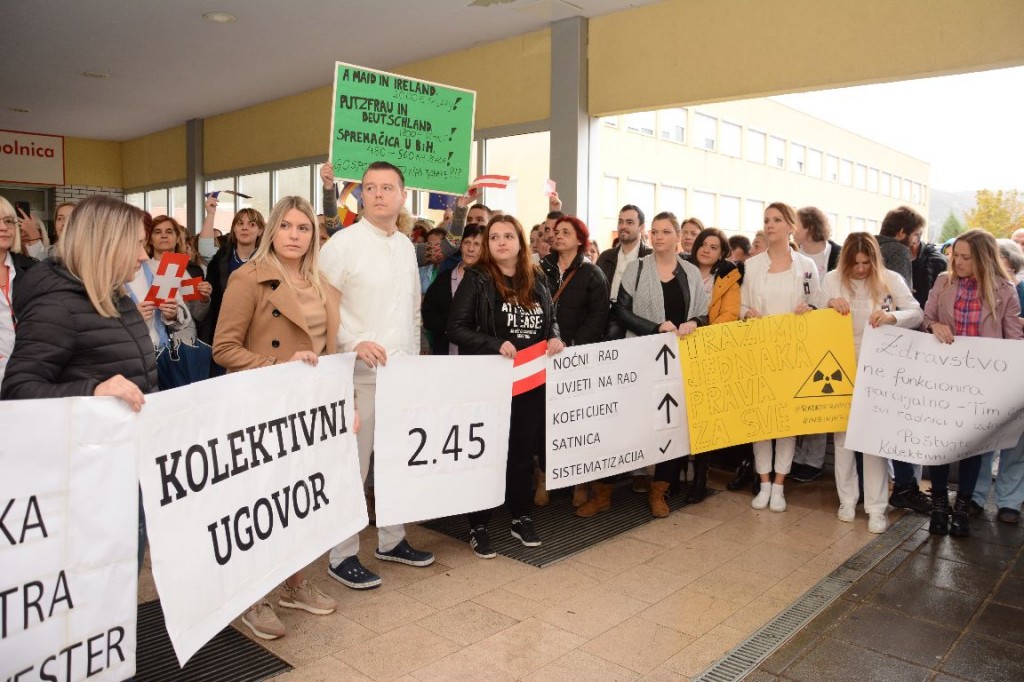 Na današnjem štrajku djelatnici su izrazili svoje nezadovoljstvo statusom medicinskih djelatnika, te jasnim isticanjem zastava Švicarske i Njemačke najavili svoj odlazak iz BiH.