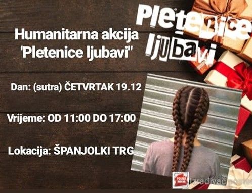 Na mostarskom Španjolskom trgu 19 . prosinca održati će se humanitarna akcija "Pletenice ljubavi" koju organizira Mateja Lovrić koja će trajati od 11 do 17 sati .