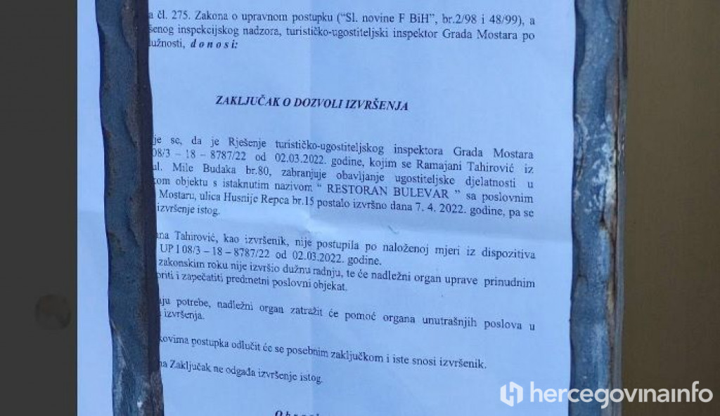 “Postupajući turističko-ugostiteljski inspektor je izvršio inspekcijski nadzor po službenoj dužnosti iniciran službenom zbilješkom djelatnika PU Mostar-Centar, te dana 23.2. 2022. godine u 19:30 sati zapisnički konstatirao da se u ugostiteljskom objektu s istaknutim nazivom Restoran BULEVAR, s poslovnim sjedištem u Mostaru, ul. H. Repca 15, obavlja ugostiteljska djelatnost bez prethodno pribavljenog rješenja za rad nadležnog organa, te nakon protokolirnja istog donio rješenje o zabrani rada 2.3.2022. godine. Navedeno pismeno nije uručeno odgovornoj osobi, (dostava pokušana dva puta), te je vraćeno Službi za inspekcijske poslove, a koje su inspektori osobno dostavili dana 23.3. 2022. godine u 19 sati, (o istom sačinjena službena zabilješka), te od toga dana teče zakonski rok od 15 dana za postupanje po navedenom rješenju. Rješenje o zabrani rada je postalo izvršno dana 7.4. 2022. godine, kada je inspektor izvršio kontrolni inspekcijski nadzor izvršenja rješenja te utvrdio i zapisnički konstatirao da je vlasica podnijela zahtjev za osnivanje ugostiteljske radnje, dana 29.3.2022. godine o kojem u trenutku inspekcijskog pregleda nije odlučeno”.