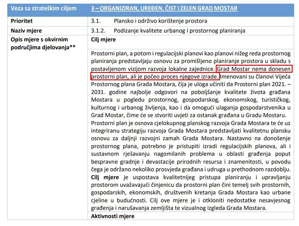 Nevjerojatno je da su u materijalu Strategije iz 2021. godine sami naveli da Grad Mostar nema donesen prostorni plan, ali da je započet proces njegove izrade.