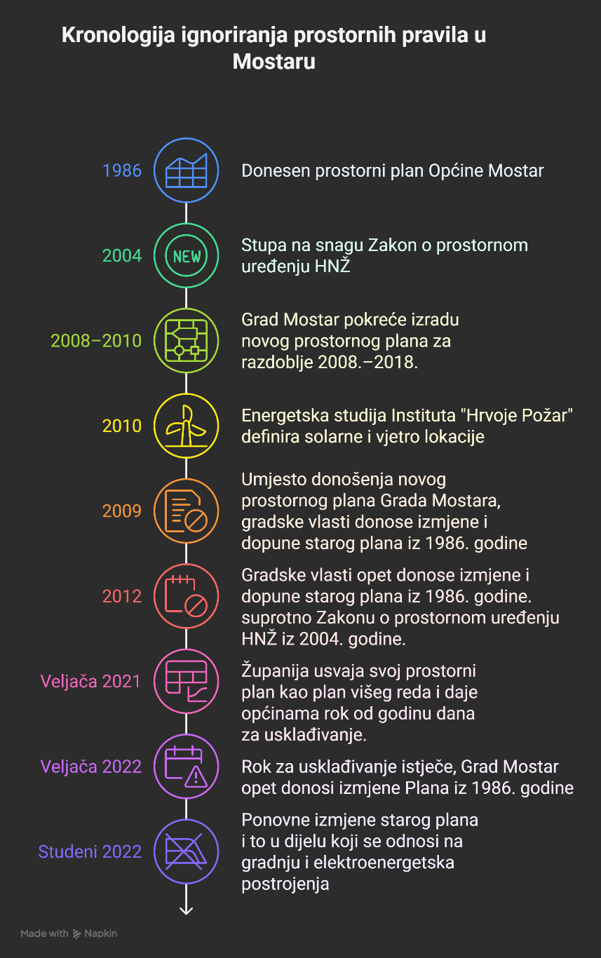 Grad Mostar ne može mijenjati prostorni plan donesen po zakonima iz bivše države i temeljiti odluke o njegovim izmjenama i dopunama na Zakonu o prostornom uređenju HNŽ iz 2004. godine. Bio je dužan donijeti novi prostorni plan, što je predstavljalo zakonsku obvezu i početnu namjeru saziva Gradskog vijeća 2020–2024. Taj je proces napušten nakon što je u grad stigao novac i pojavili se interesi investitora, čime su zakon i javni interes gurnuti u stranu.