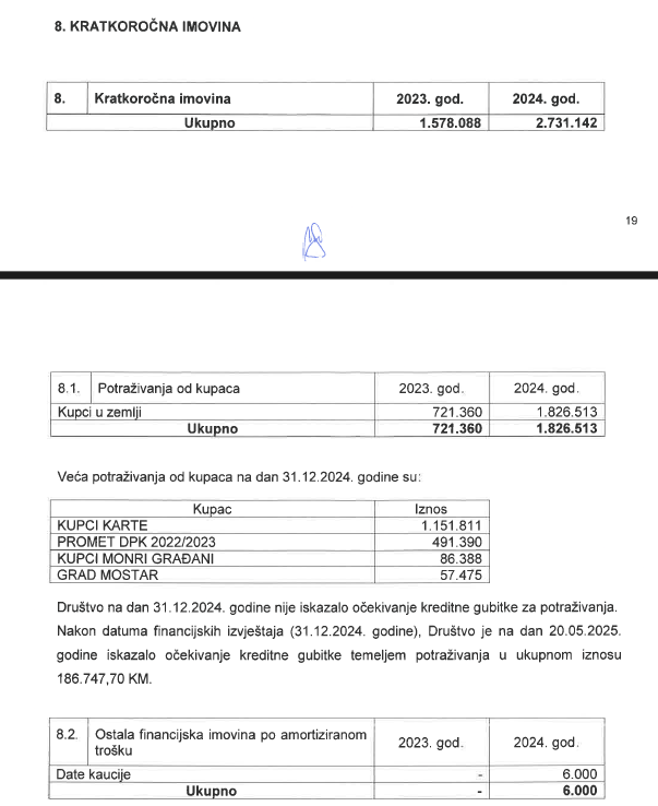 Međutim, u pozadini tog rasta stoje nenaplaćena potraživanja od 1,83 milijuna KM, dio potraživanja je već evidentiran kao kreditni gubitak od 186.747 KM, i to tek nakon datuma zatvaranja bilance – 20.5.2025., dakle retroaktivno.