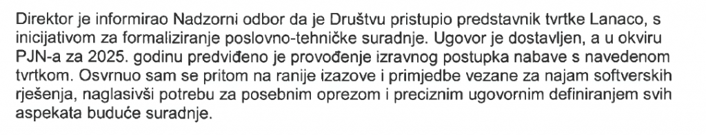 U zapisniku sa sjednice Nadzornog odbora JP Mostar Parking navedeno je da je nakon nekoliko neuspješnih pokušaja provođenja javne nabavke za softver, predstavnik firme Lanaco sam pristupio poduzeću s inicijativom za formaliziranje poslovno-tehničke suradnje. Direktor Ivan Barbarić izvijestio je Nadzorni odbor o toj ponudi, naglasivši kako je ugovor već dostavljen, ali da će se tek u okviru Plana javnih nabava za 2025. godinu provesti izravni postupak nabave.