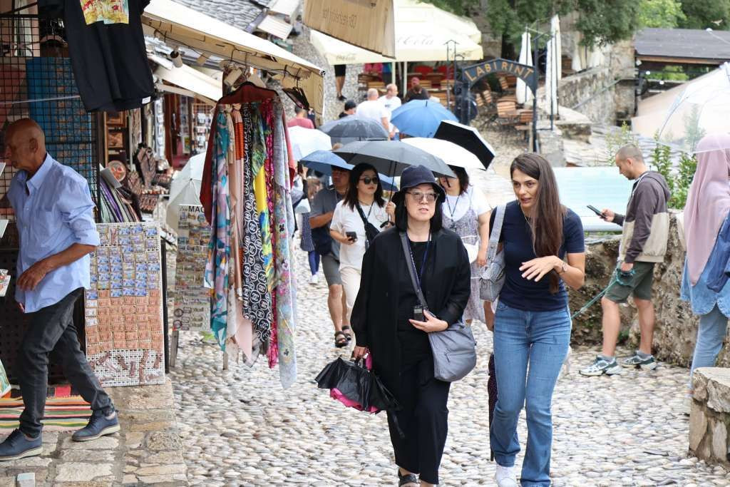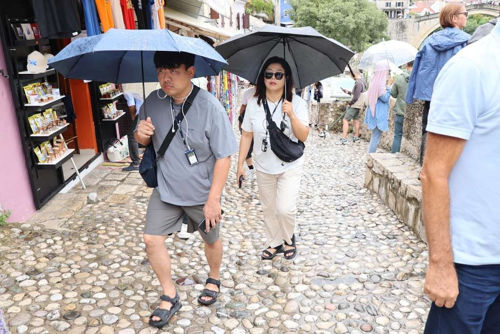 Iako je zamjetan manji broj turista u odnosu na prethodne tjedne, Mostar i dalje bilježi posjete, a kiša nije spriječila brojne posjetitelje da uživaju u znamenitostima grada i šetnji starom gradskom jezgrom, prenosi Fena.