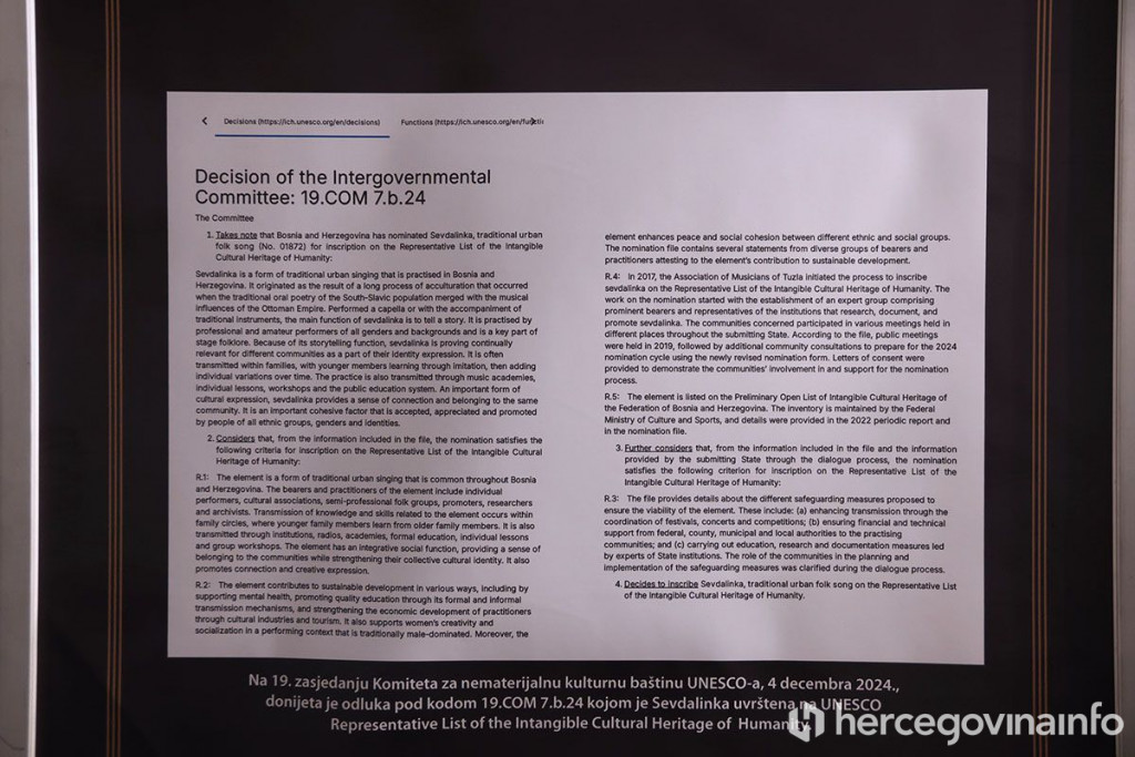 Proces upisa sevdalinke na Reprezentativnu listu UNESCO-a trajao je nekoliko godina. 4. prosinca 2024. godine objelodanjeno je da sevdalinka postaje dio kulturnog mozaika svijeta, dostojan reprezent kulture naroda i bogatstva nematerijalne baštine Bosne i Hercegovine. Istim povodom programi su održani u Sarajevu i Tuzli.