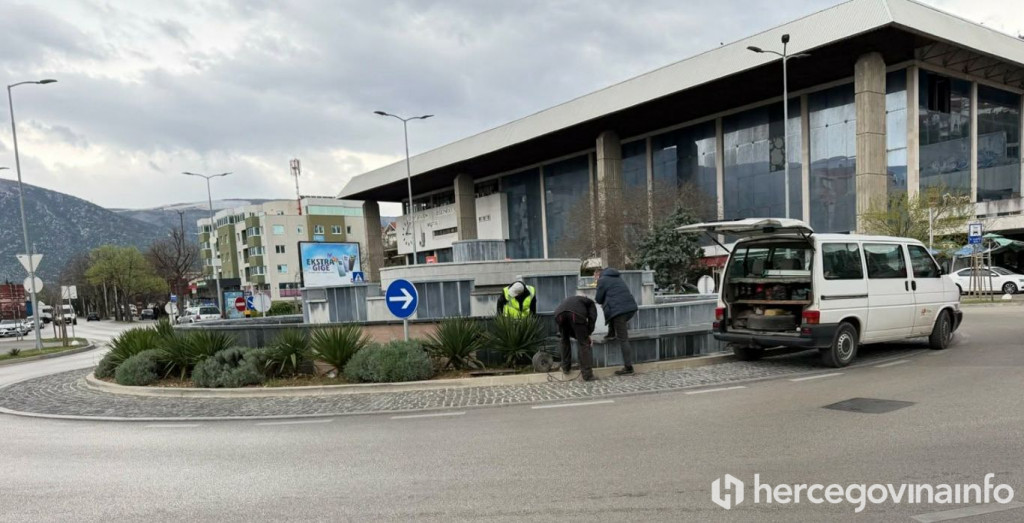 Na fontani u kružnom toku kod autobusne i željezničke stanice u Mostaru danas su započeli sanacijski radovi, nakon što su s objekta otpale pločice, a površina već mjesecima zapuštena.