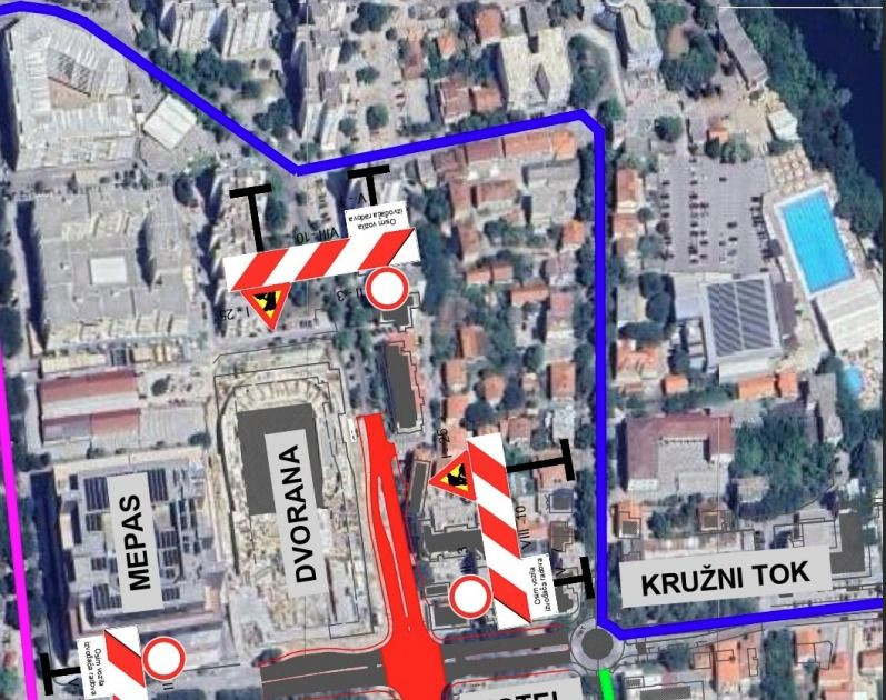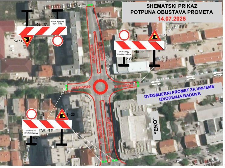 Za srijedu, 16. srpnja, najavljena je potpuna obustava prometa na raskrižju kod hotela Ero, čime će biti onemogućeno prometovanje iz smjerova Španjolskog trga, Centra II, Mepasa i novog kružnog toka prema tom raskrižju.