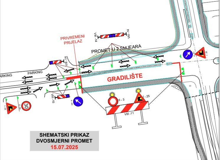 Dan kasnije, u utorak 15. srpnja, bit će uspostavljena privremena regulacija prometa u ulici Kardinala Stepinca – od raskrižja kod hotela Ero do ulaza u garažu Mepas Malla.