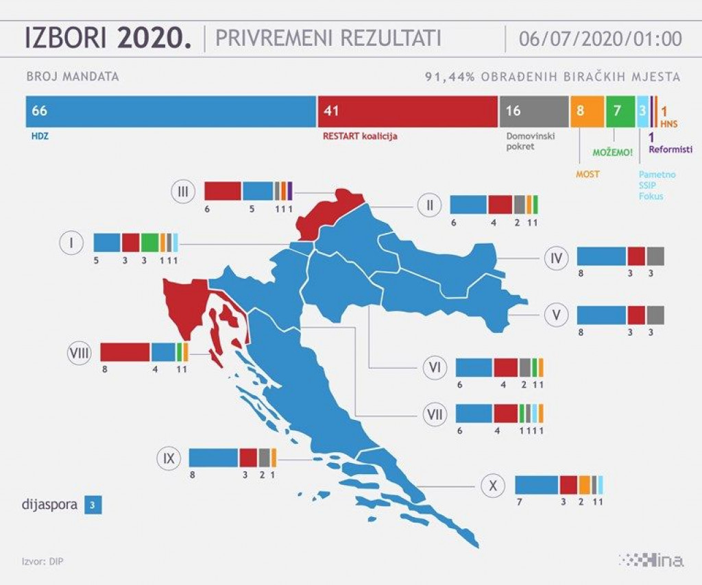 HDZ je na parlamentarnim izborima održanima u nedjelju osvojio najviše mandata u osam izbornih jedinica i u inozemstvu, dok je Restart koalicija pobjedu odnijela u dvije izborne jedinice.