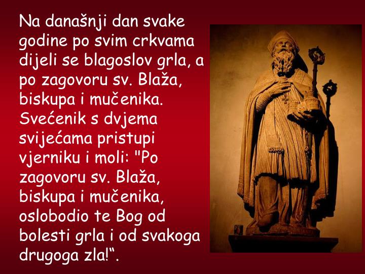 I pred samu smrt na stratištu, molio je Boga da milosrdno usliši molitvu svakome tko boluje od grlenih bolesti, a zazove svečevu pomoć pred Bogom. Legenda veli da se tada pojavio iznad sveca svijetli oblak iz kojeg se začuo glas: "Ja sam onaj Bog koji te do sada proslavio, a nadalje ću te još većom slavom uzvisiti. Udijelit ću svoju milost onima koji budu slavili tvoju uspomenu." Od tada se kroz sva stoljeća do naših dana slavi ta uspomena na sv. Blaža obrednim grličanjem.