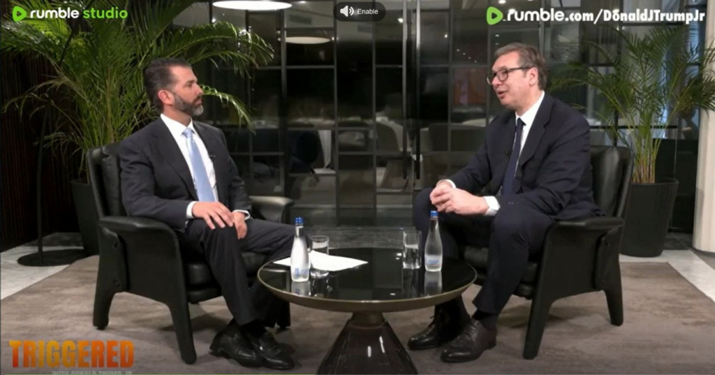 Donald Trump Jr., najstariji sin američkog predsjednika, sinoć je na platformi Rumble objavio podcast u kojem je ugostio Aleksandra Vučića. Srpski predsjednik govorio je o prosvjedima koji već mjesecima traju diljem Srbije. Istaknuo je da iza njih stoje nevladine organizacije koje su financirane izvana.