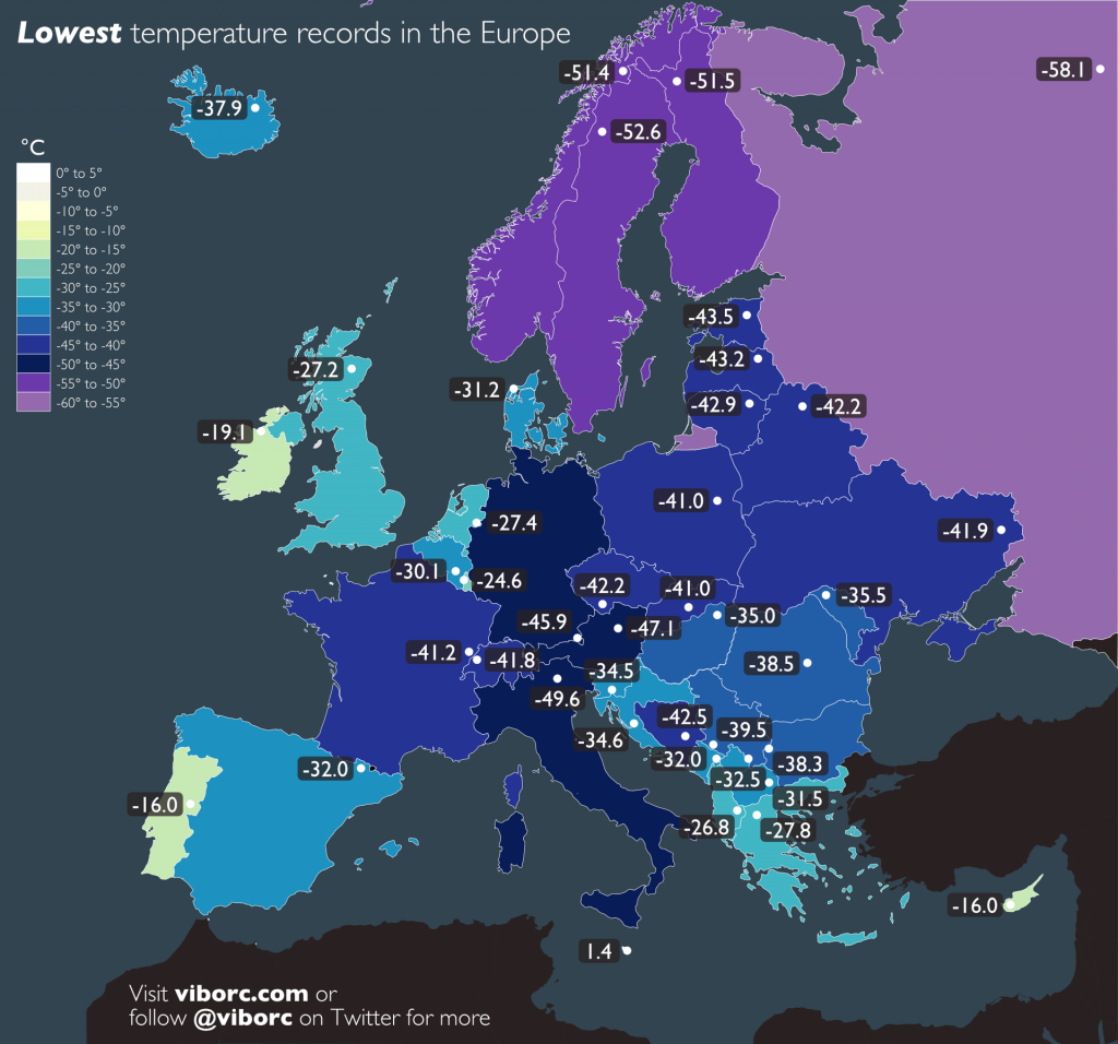 Vibor Cipan, zagrebački IT-jevac, suosnivač tvrtke UX Passion, objavio je na svojim stranicama infografike s najnižim zabilježenim temperaturama u pojedinim europskim zemljama. Najniža temperatura, nimalo iznenađujuće, zabilježena je u Rusiji, -58,1 stupanj. Daleko nisu ni skandinavske zemlje. S druge strane, najtoplije je na samom zapadu Europe.